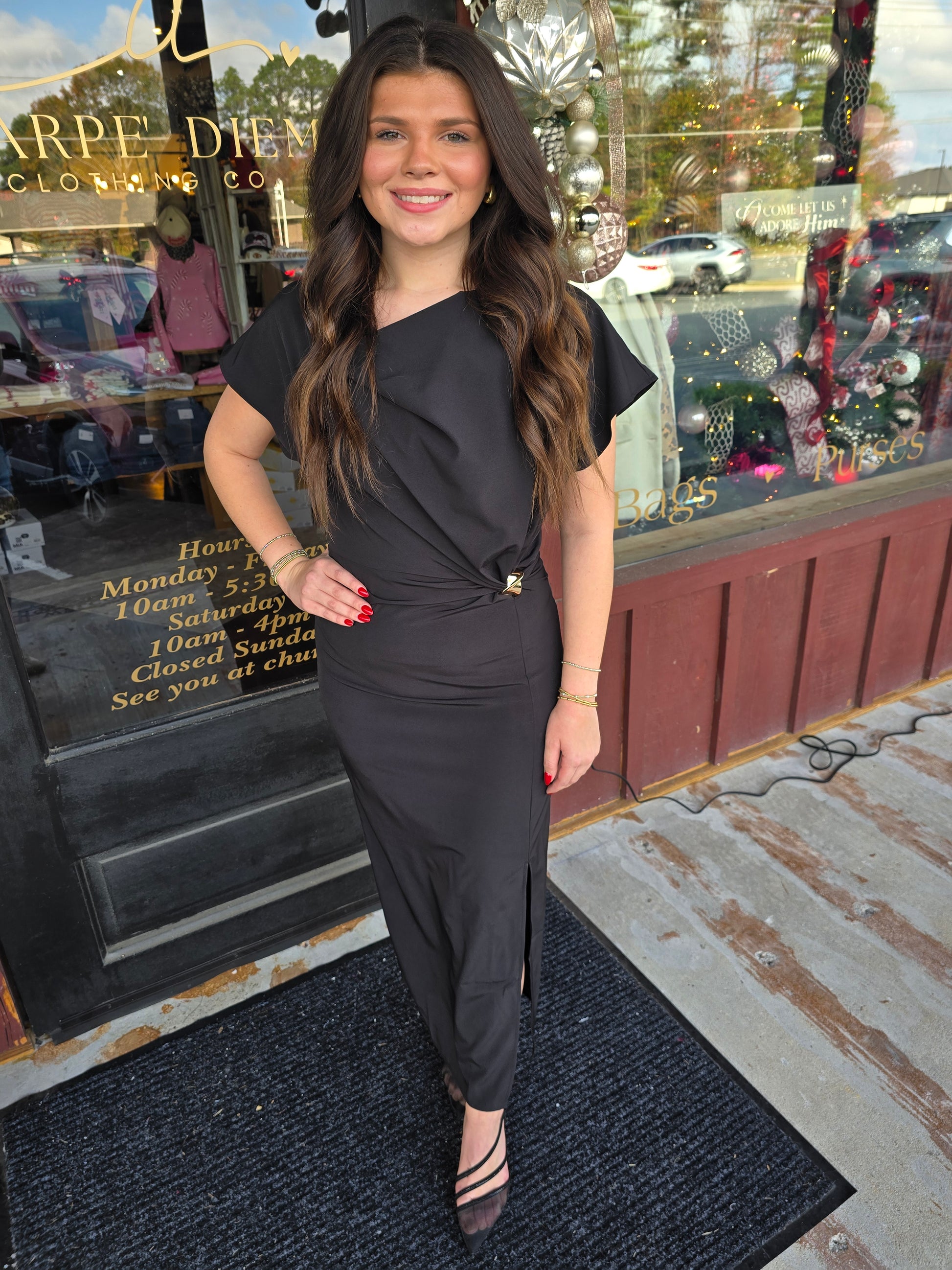 Slip into effortless elegance with this stunning satin midi dress. The draped neckline creates a flattering silhouette, while gold ring gathering details at the side add a touch of glamour. Crafted from lightweight, non-sheer woven satin with a discreet back zipper and full lining for comfort and confidence. Perfect for date nights, cocktail events, or whenever you want to feel absolutely fabulous.