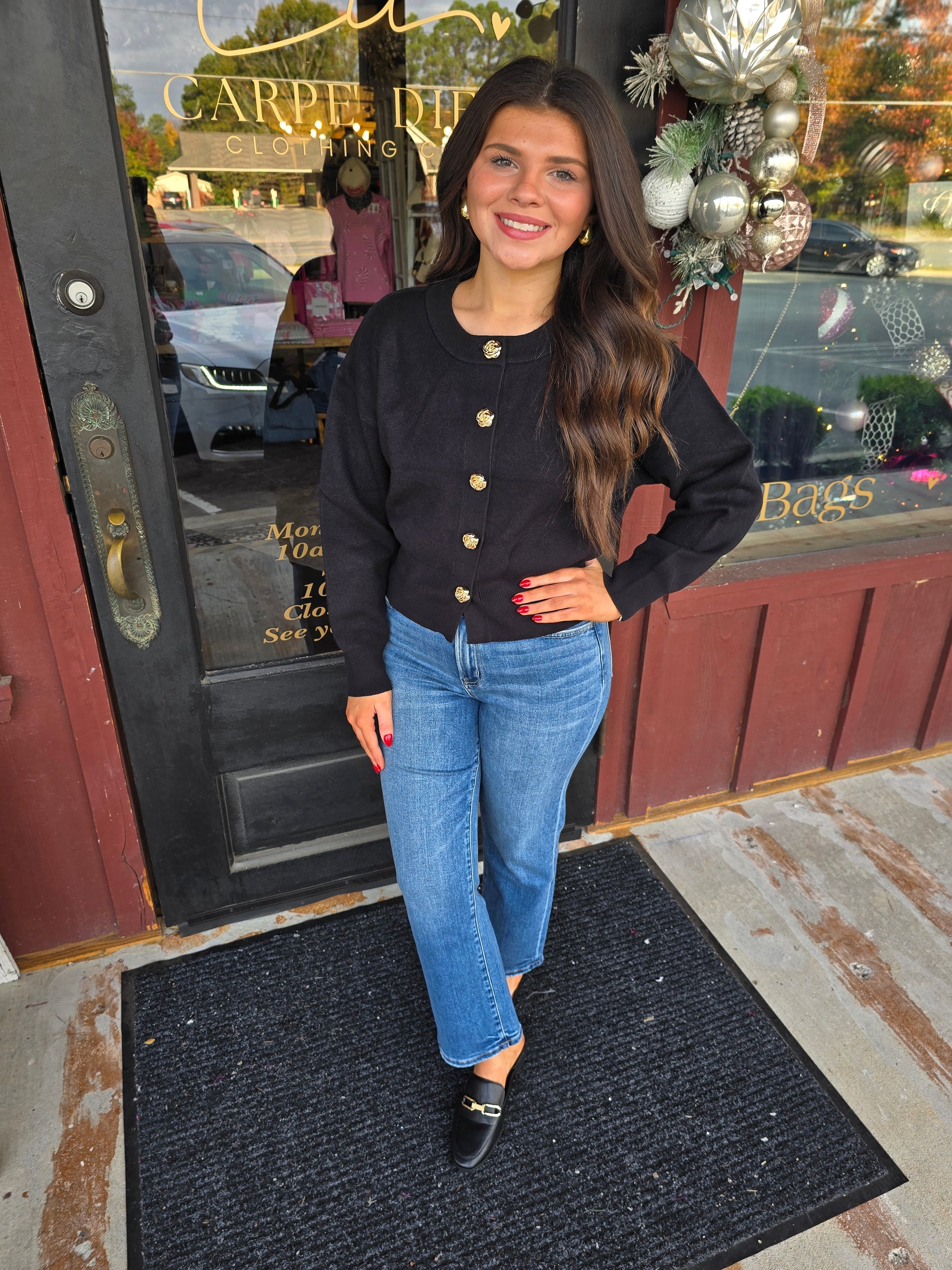 "Glitzed" Black Sweater Knit Gold Button Cardigan